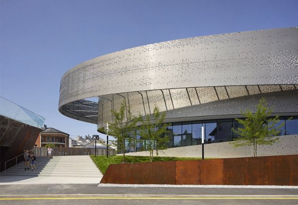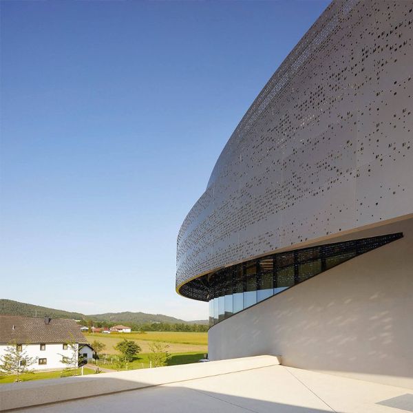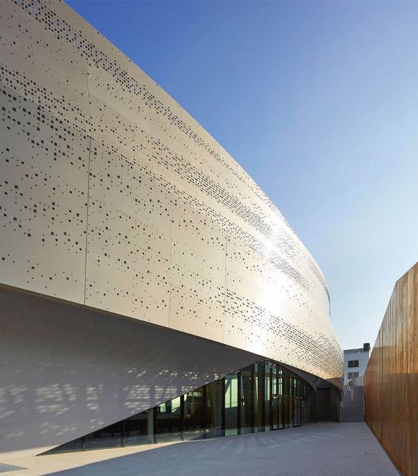 建筑物的承重體系包含九個裝在穿孔薄板中的芯子,中間是開闊的空間,可以欣賞到周圍的景色,同時也便于自然通風。邁出的每一步都將帶來新的視角,曲面的玻璃面向外部景觀的不同部分。