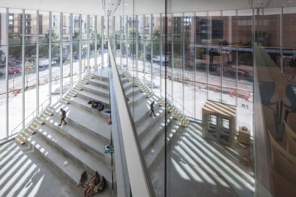 BIG的創始人兼創意總監Bjarke Ingels解釋說:“阿靈頓市區的密度成為了這所學校的靈感來源——我們將教室扇形排列,讓每一層樓都與下面教室頂部的屋頂花園相連,由此形成的層疊梯田通過一個彎曲的樓梯連接起來,這個樓梯貫穿了所有樓層的內部和外部,使不同課程和年齡段的所有學生在視覺和身體上都相互聯系。每個露臺都進行了景觀設計,不僅適合學生的社交生活,還可以作為非正式的戶外學習空間。”
