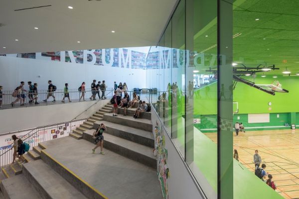 旋轉的中央樓梯穿過建筑物的內部,以連接四層露臺,使學生可以在室外交流,并在社區和學校之間建立更牢固的聯系。上層露臺更適合于私密課程和安靜的學習區,寬敞的第一層露臺和18,700平方英尺的休閑場地也可作為學校和社區活動的公共活動場所。