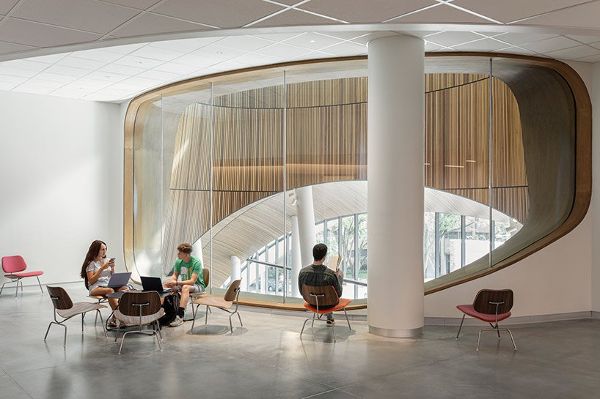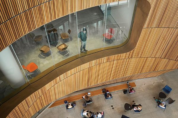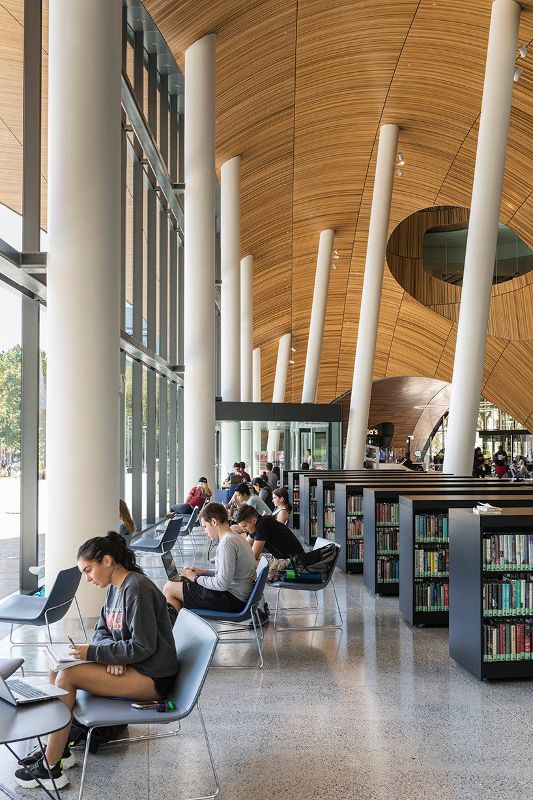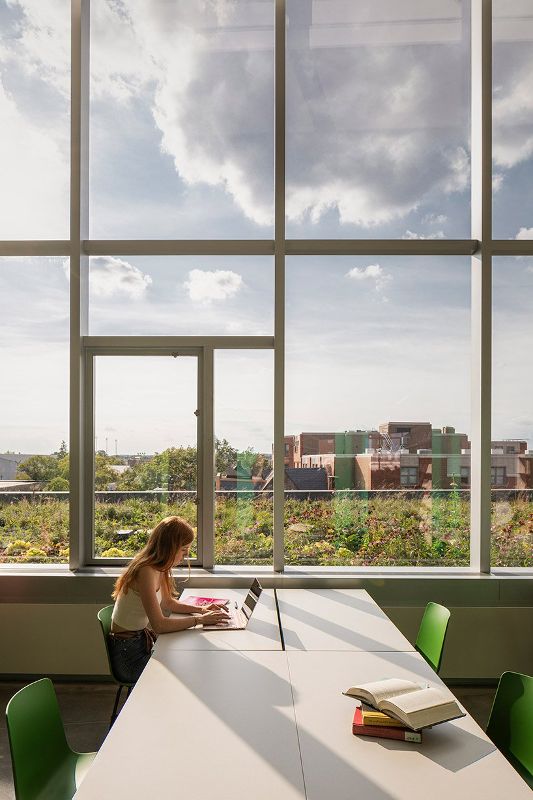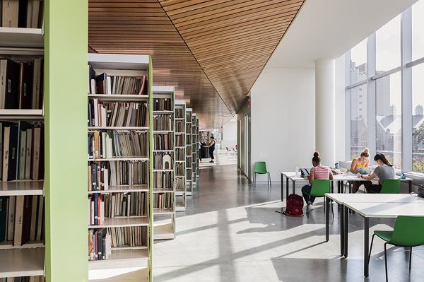 圖書館的設計確保了學生的技術需求,采用全移動技術策略,提供筆記本電腦和便捷的收費銀行。40多個會議室和學習空間都是可預訂的,圖書館在提供適合學生新需求的課程的同時,也提供了傳統學術型圖書館專注的研究體驗。寧靜、充滿陽光的四樓鼓勵游客漫步于圖書館可瀏覽的藏書堆中。兩個寬敞的閱覽室平衡了這層樓的南北兩端,四面都是玻璃,可以欣賞到茂盛的綠色屋頂。