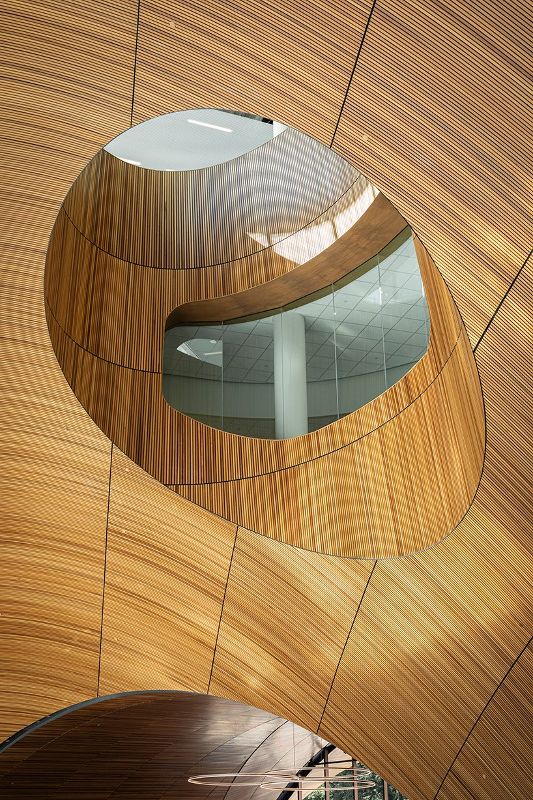 在內部,大堂的圓頂中庭可以看到大樓的每一個角落,它作為一個導航錨,將用戶放在圖書館活動的中心。雪松覆蓋的圓頂上雕刻了一個眼睛形狀的孔洞,允許光線從最上面的樓層進入大堂。一進入口便可以看到一個鋼結構的樓梯,它突出建筑的流通性,邀請人們向上行走。當人們在建筑物中行走時,這種視覺和物理上的連接使他們能夠保持方位感,并鼓勵他們使用建筑里的所有資源。