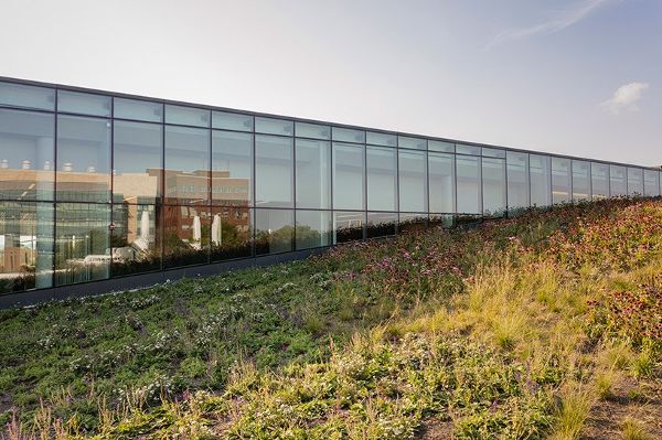 ?47300平方英尺的綠色屋頂覆蓋了該建筑70%以上的屋頂表面,是賓夕法尼亞州最大的綠色屋頂之一,在該建筑的雨水管理系統中發揮著關鍵作用。查爾斯圖書館場地的設計是為了最大限度地收集和保留雨水,包括綠色屋頂,地面可透水的廣場和道路,可滲入雨水的園景種植地,以及兩個地下集水區,在暴雨期間可以一起儲存和處理近50萬加侖的水。