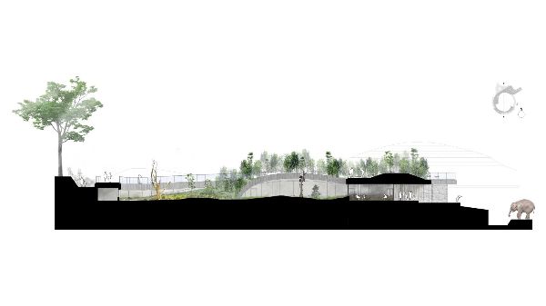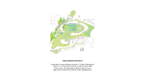 封閉空間被升高以形成地下的廄和其他設施,同時將它們隱藏并整合到景觀中。通過在陰陽符號的兩端抬起大地,形成起伏的景觀,讓人們可以直接看到熊貓的棲息地。同時,棲息地中遍布的各種植物、巖石、攀援樹和樹干,使熊貓可以在公眾仍能看到的情況下撤退、休息、進食或尋找樹蔭。夏季,盆地、溪流和瀑布等各種水元素都可以為大熊貓?zhí)峁┴S富的生活和涼爽的生活。