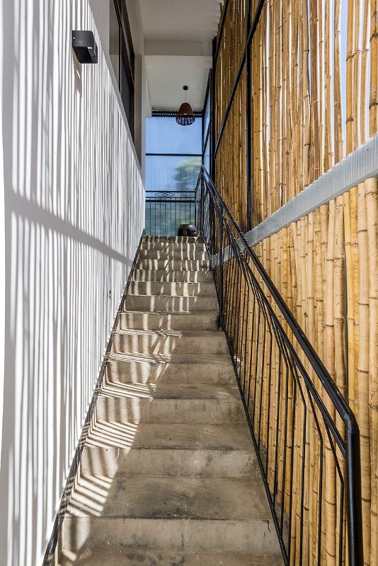 所有材料都是天然的和原始的,增加了與自然的聯系。該項目使用石磚、木材和竹子,尤其是對該地區典型竹子的運用。設計師使用竹子覆蓋了主立面,重新詮釋了該地區傳統建筑在當代的使用形式。然后,他們將北立面整合到周圍的竹林中,沿立面調整竹竿以形成百葉窗。