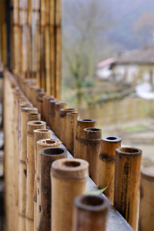 用竹竿的垂直線條創造了一個圖形游戲,人們可以透過這些垂直元素之間的開口看到外面的風景。由于該地區溫度的變化,竹子的直徑會隨著時間脹縮,使竹子的有機表面破裂并顯示出時間的皺紋。竹子的這種自然現象創造了一種詩意的時間視覺。