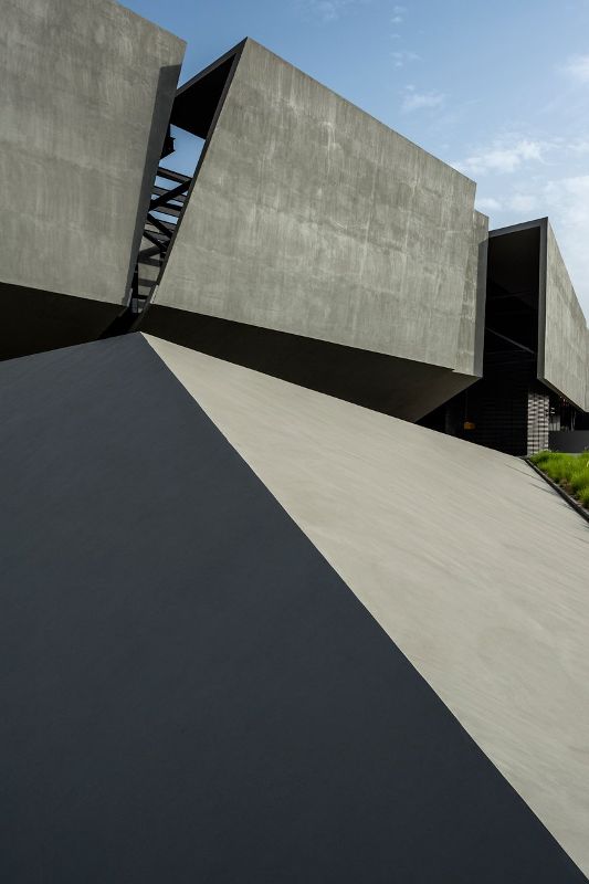 該建筑在其外部雕塑空間中結合了水泥和黑玻璃,而由十多個鋼結構組成的多頭鋼屋頂則包裹并連接了“石頭”碎片。同時,巨大的黑色窗戶與不同的碎片融合在一起,在“盾牌裂開”之間呈現出黑色的斑紋,進一步將所有內容連接在一起。在內部,運營功能和相關空間之間保持著持續的平衡,探索了一種在辦公環境中的新生活方式,在辦公環境中,人與人之間的協作是項目的主要焦點之一。內部走道被想象成與不同建筑碎片相交的車道,這些碎片代表了設計用于容納各種功能的“集群”。