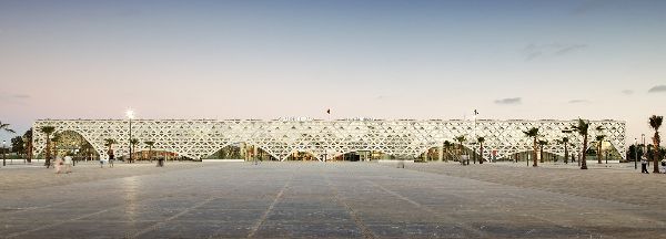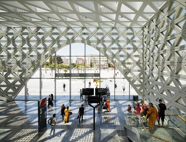 車站的立面是城市景觀中的氣勢雄偉的屏風,如同一個巨大的城市馬什拉比耶元素肌理。立面模仿阿拉伯住宅的木格元素,可滲透穿過廣場和客運大樓的人流。外墻長200米,相當于標準高速火車(TGV)的長度,高12米,由800多個三角形的纖維增強超高性能混凝土塊組成,通過8個不同幾何結構的宏偉拱門俯瞰城市一側寬闊的大理石和混凝土廣場。