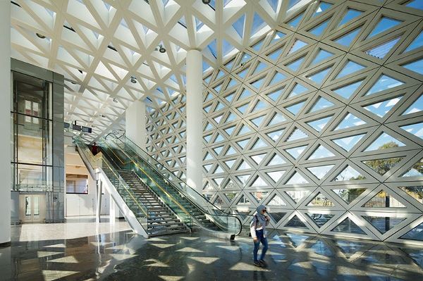 建筑表皮上三角形圖案的靈感來自于伊斯蘭建筑,設計師將這種元素擴展到城市建筑的規模,以創造光、影和透明度之間的完美平衡,立面的主題成為一個巨大的框架和過濾器,通過它可以看到城市。馬什拉比耶建筑元素的應用為應對車站室外溫度的強烈季節性變化提供了一種方法。