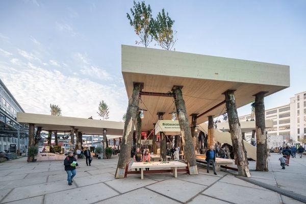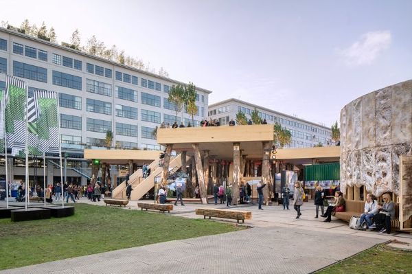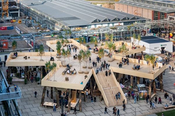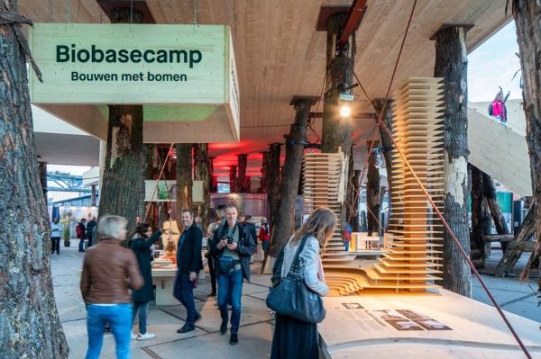 “生物大本營”由Marco Vermeulen工作室設計,這個設計是設計師和業主探索“未來混凝土”可能性的起點。展館通過用木材代替混凝土、鋼材等傳統建筑材料,表達了“樹上建筑”對減少大氣中二氧化碳和氮含量的貢獻。