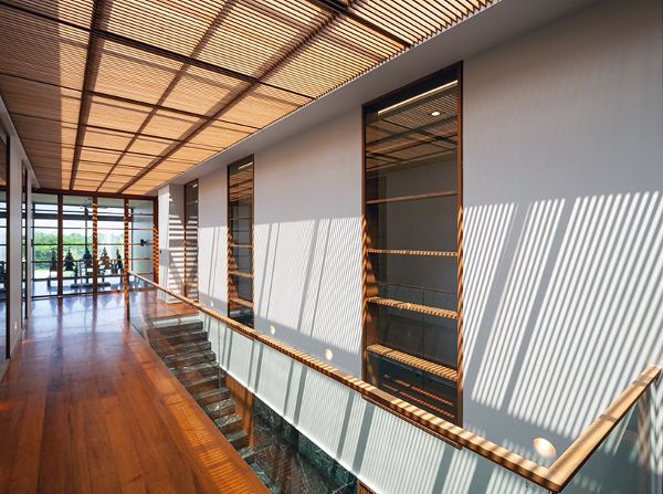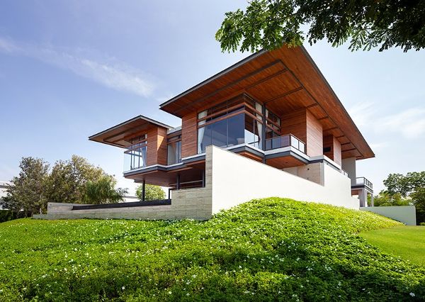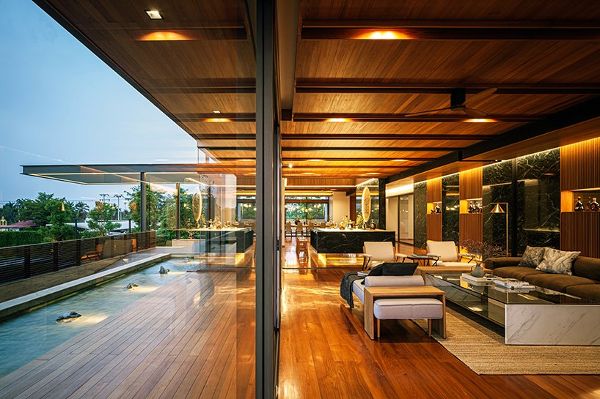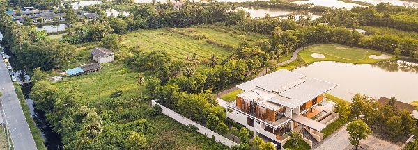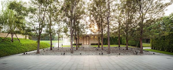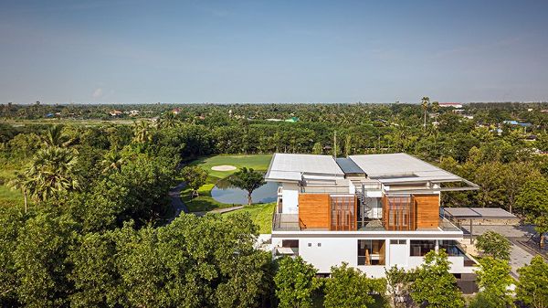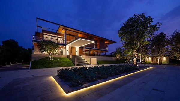 Junsekino把房子放在地塊的一邊,以享有附近湖景和高爾夫球場的景觀視野。建筑師還根據風水限制,使三層的房子看起來只有兩層。他們通過清楚地分離建筑并將房屋的一部分沉入地下來實現了這種設想。所有服務區,包括車庫和維修區,均位于地下室地板上,且被景觀所隱藏。