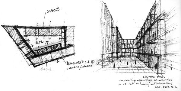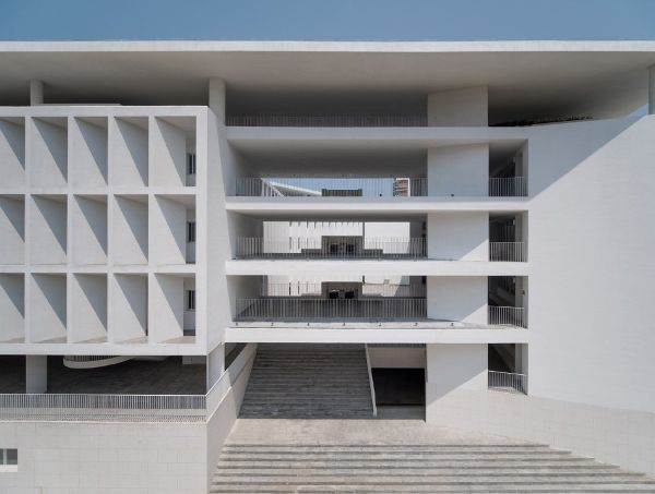 由于場地限制,教學(xué)樓和宿舍樓在架空部分被抬高,以開放首層空間。教學(xué)樓的中央庭院抬升到二樓,通過一個大樓梯與操場相連,不僅可以作為放松和交流的場所,還可以作為觀眾的看臺。