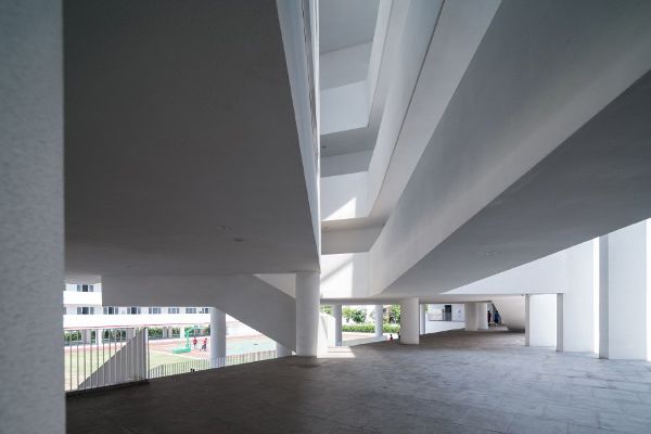從結(jié)構(gòu)上看,由于環(huán)島地區(qū)特殊的地震地質(zhì)條件,采用了隔震體系進行抗震。該建筑還對該地區(qū)的熱帶氣候作出了回應(yīng):底層架空的方式提供遮陽和防風(fēng)雨保護,而柱廊則促進了自然通風(fēng)。最后,屋頂平臺為學(xué)生提供了額外的活動空間,同時降低了熱量吸收和室內(nèi)溫度。