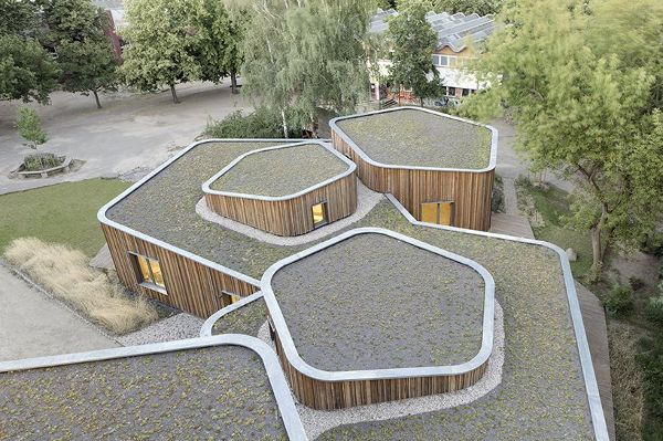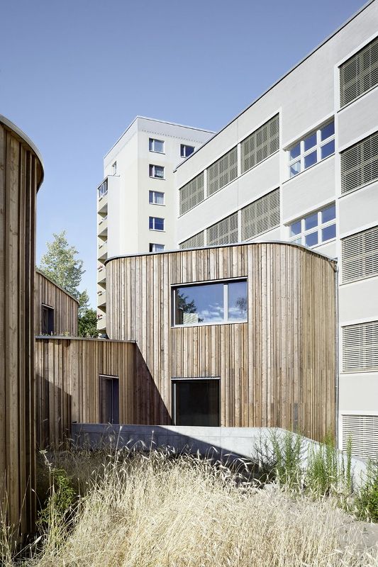 新的托管中心和后來的擴展設施是由Mono設計的,其樣式與現有建筑完全不同。托管中心建在學校的院子里,一直延伸到體育館,為校園提供了一個通向街道的結構和一個清晰的中心。建筑形體的凹凸空間為各種用途創造了不同的戶外區域。建筑物采用了屋頂綠化,這些屋頂向不同的方向傾斜,再加上木質外墻的上升檐篷,形成了雕塑感。