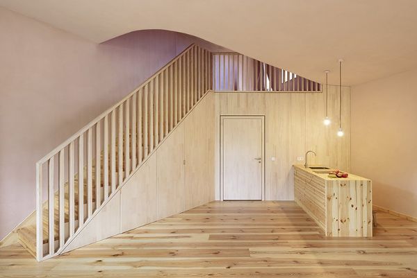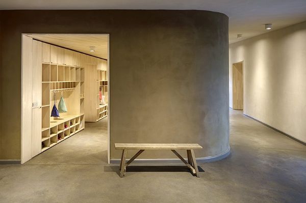 中央通道區域從現有的樓梯蜿蜒穿過新建建筑的底層,并伴有巨大的粘土墻。休息室、衣帽間等各種戶外出口交替出現。集體活動室在粘土墻后面,衣帽間上方有一個平臺,可以看到周圍樹木的樹冠。
