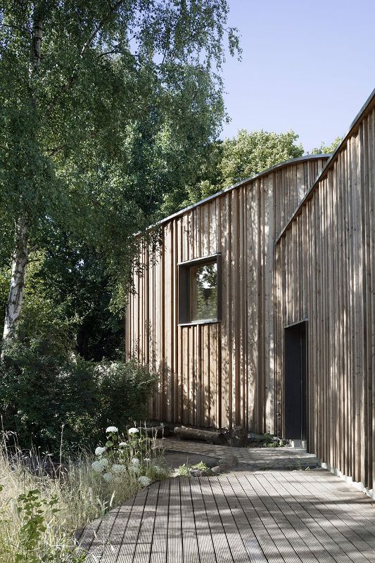 該建筑采用帶纖維素屋頂的木質框架結構,外墻填充了建筑秸稈,并在內部抹上了粘土。外立面由不同尺寸的垂直落葉松木板制成。區域供熱作為一種能源,為墻體和地下供熱。衣帽間的分散排氣系統支持手動通風概念。