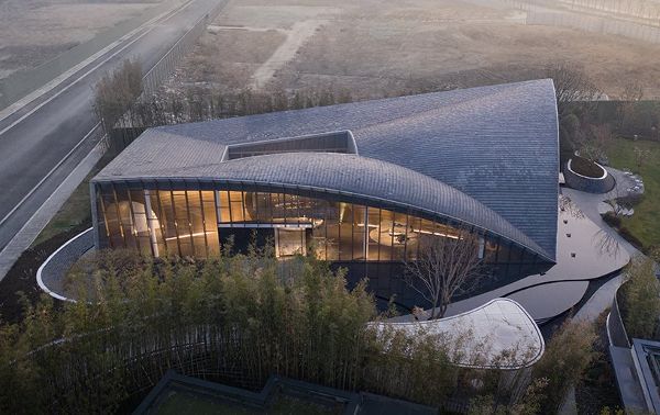 這些功能是圍繞一個封閉的中庭空間布置的,有點像中國傳統(tǒng)建筑。建筑體量的一角俯伏在水面上,延伸到周圍的景觀中,通過強調(diào)天地之間的統(tǒng)一性來代表古代中國文化,同時賦予建筑一種輕盈而動感的外觀。外立面設(shè)有巨大的落地玻璃窗和許多長長的幕墻柱,類似于傳統(tǒng)的木質(zhì)格柵,實現(xiàn)了室內(nèi)外環(huán)境的視覺連接。