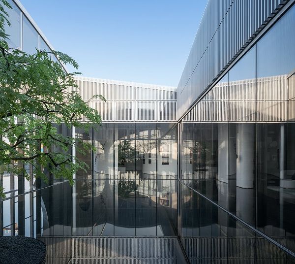 屋頂覆蓋著中國南方常見的石板。這種材料的選擇彰顯了江南簡單而優(yōu)雅的建筑語言,而自然的質(zhì)感與輕巧透明的玻璃幕墻形成了有效的對比。主立面為不銹鋼柱,為降低施工成本,對立面進行分段。在這些部分中,已安裝了不銹鋼穿孔板,以使外觀更加精致。
