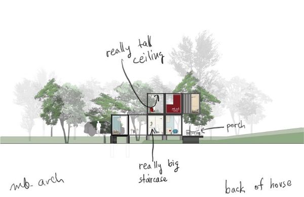 建筑師們以Insta House為藍圖,在北側增加了一個40英尺的集裝箱,通過一條玻璃人行道將兩層樓高的開放式生活區連接到一個獨立的臥室翼樓。另外還有一個10英尺高的集裝箱懸掛在二樓。
