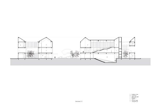 壽縣文化藝術中心建在老城區東南兩公里的一塊空地上,由多個大小不同的庭院組成,這些庭院被放置在一個相對封閉的矩形體塊中。庭院之間由蜿蜒起伏的人行道相連,形成一個不受陽光和雨水侵蝕的公共環路。主入口的一個寬敞的庭院形成了一個公共廣場,代表典型的壽縣民居的中央房間,而更多的私人區域則受到當地住宅中私人花園的啟發。