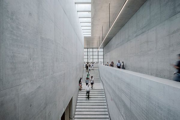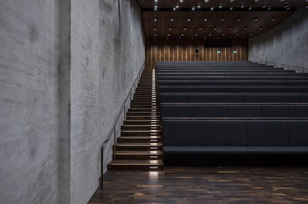 裸露的混凝土墻在樓下的夾層繼續(xù)延伸,該層設(shè)有博物館商店、衣帽間、衛(wèi)生間和儲物設(shè)施。地下室層設(shè)有一個300座的大禮堂和臨時展覽空間。 JUNG LS990點亮了詹姆斯·西蒙美術(shù)館的所有內(nèi)部空間。