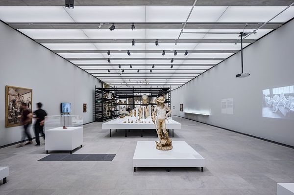 從一個通風(fēng)良好的新入口進入,參觀博物館的游客爬上一段寬闊的樓梯,這段樓梯通向“考古”長廊,在未來,長廊將連接島上五個博物館中的四個。它的新庭院將畫廊與對面的新博物館和佩加蒙博物館相連。中央大堂將咖啡廳圍起來,大堂通向一個大露臺,并沿著整個建筑的一側(cè)延伸。餐廳采用光滑、裸露的混凝土,與黑胡桃木膠合板、大理石、青銅扶手和貝殼石灰石地板形成鮮明對比。