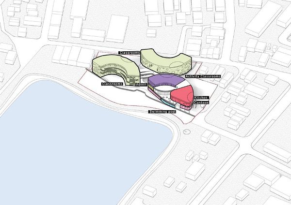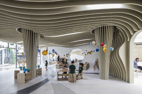 “設(shè)計(jì)語言——有機(jī)的形狀、簡單的建筑線條、原色、按年齡劃分的不同立面/窗戶——這些都關(guān)乎到了兒童成長,對兒童友好而又不幼稚。” LAVA董事Chris Bosse評論道,“一個(gè)面向下一代的教育項(xiàng)目向我們提出了挑戰(zhàn),讓我們質(zhì)疑自己的教學(xué)方式。我們創(chuàng)造了一個(gè)新的學(xué)習(xí)環(huán)境,鼓勵(lì)發(fā)現(xiàn)、好奇心、與自然的互動和以活動為基礎(chǔ)的學(xué)習(xí),以促進(jìn)兒童的全面發(fā)展,而不是一個(gè)有老師在前面,孩子們排成一排聽課的方式。這一愿景是通過一種基于自然及其結(jié)構(gòu)幾何的設(shè)計(jì)語言實(shí)現(xiàn)的,這種設(shè)計(jì)語言激發(fā)了人們對世界的有趣探索。”