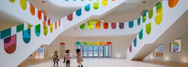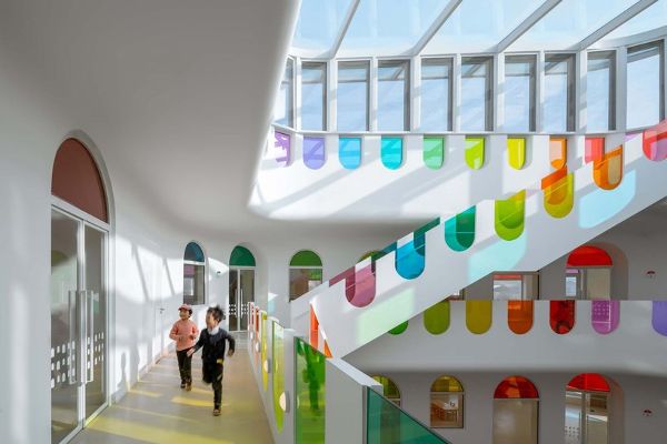 ?SAKO建筑設(shè)計(jì)事務(wù)所用483塊多色玻璃裝飾了這座位于中國(guó)天水的幼兒園。工作室將彩色元素應(yīng)用于玻璃門(mén)窗上,以及走廊和樓梯的扶手上,在原本極簡(jiǎn)主義的建筑中營(yíng)造出萬(wàn)花筒般的效果。