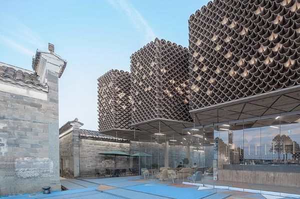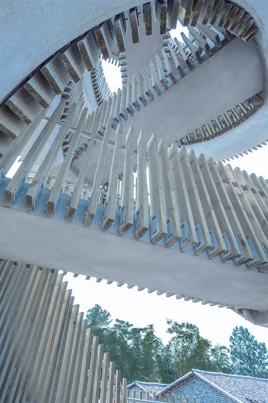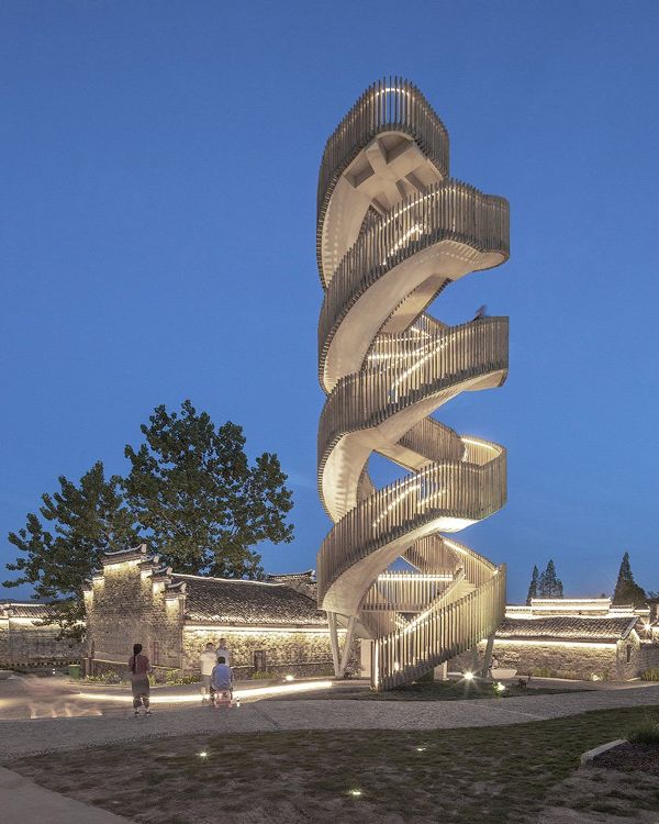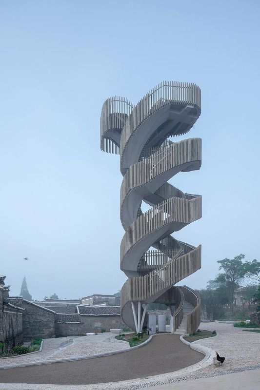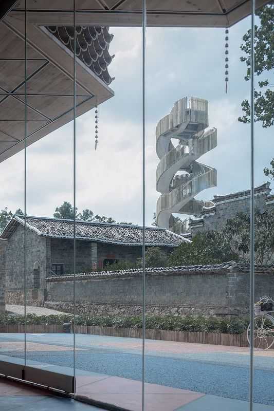 同時(shí),兩個(gè)新的建筑構(gòu)成了規(guī)劃的一部分。一座鐘樓,靈感來(lái)源于古代用于防御的觀測(cè)建筑,由兩條相互纏繞的路線組成——松散地如同一個(gè)巨大的中國(guó)“龍柱”。這座塔樓可以俯瞰村莊和周?chē)木吧?,是社區(qū)的新地標(biāo)。在規(guī)劃的其他地方,個(gè)新的公共大廳的設(shè)計(jì)參考了村里的百年香樟樹(shù),這里幾十年來(lái)一直被用作聚會(huì)場(chǎng)所。大廳的陶瓦外墻允許鳥(niǎo)類(lèi)在其中筑巢。