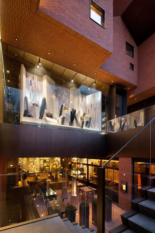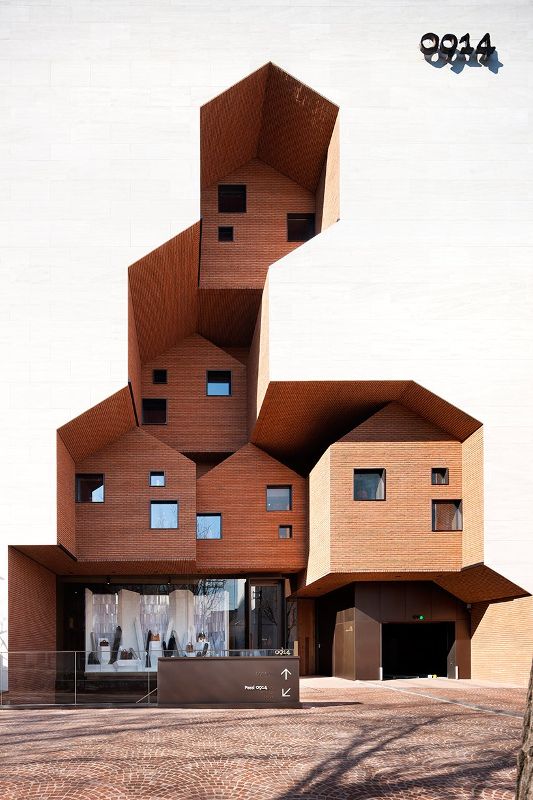 TRU建筑事務(wù)所進(jìn)行了0914旗艦店的立面設(shè)計(jì),建筑的立面是根據(jù)村莊的形象設(shè)計(jì)的,整體就像小房子堆砌在盒子里。項(xiàng)目在形式,顏色和紋理方面增強(qiáng)了雕刻效果,在純白色盒子和磚房之間形成了對(duì)比。雕刻的村莊在室內(nèi)空間里完全顛倒過(guò)來(lái),形成 了突出的小型山墻房屋,供商店和藝術(shù)家工作使用。在地下一層,引入了多層廣場(chǎng)的概念,作為一個(gè)工匠和設(shè)計(jì)師可以與顧客交流的地方。通往廣場(chǎng)的磚砌樓梯可以作為時(shí)裝秀的T臺(tái)。屋頂設(shè)計(jì)為一座高架別墅,位于隱蔽花園中水面之上。兩層的屋頂被淺水和銀色的草填滿。
