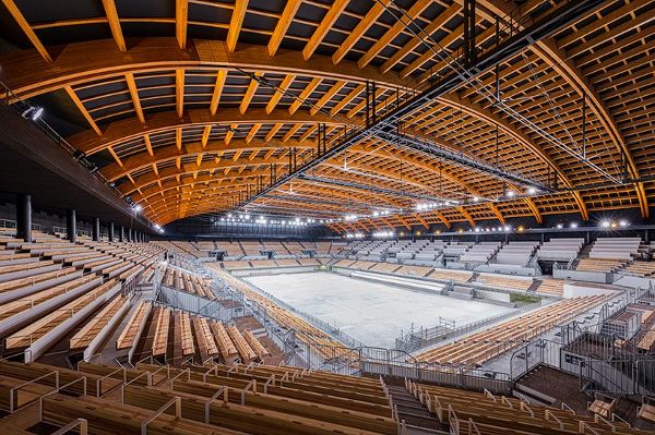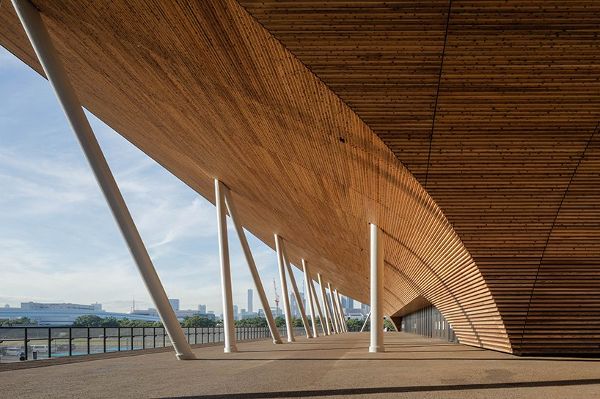 作為“漂浮在海灣中的木舟”,木材被用于屋頂結(jié)構(gòu)、立面、觀眾席和外墻。競(jìng)技場(chǎng)的天花板由一個(gè)木質(zhì)框架支撐,旨在減輕整體結(jié)構(gòu)的重量,而立面則考慮了建筑的隔音和隔熱性能。NIKKEN SEKKEI解釋說(shuō):“功能、結(jié)構(gòu)和空間緊密結(jié)合,在保證豐富性的同時(shí),設(shè)計(jì)簡(jiǎn)約而美觀,這是日本傳統(tǒng)木結(jié)構(gòu)建筑的精髓,我們希望來(lái)自世界各地的觀眾和運(yùn)動(dòng)員都能感覺到這一點(diǎn)。”