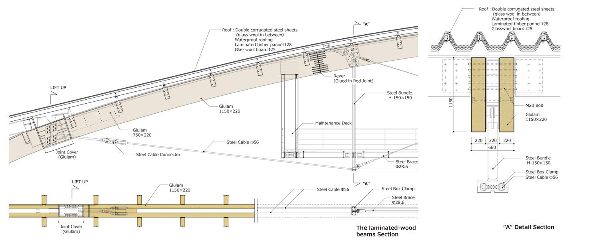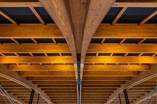 在建筑內(nèi)部,膠合層壓板木材允許跨越90米的無(wú)柱空間。設(shè)計(jì)團(tuán)隊(duì)解釋說(shuō):“我們采用了一種簡(jiǎn)單的結(jié)構(gòu),即使用具有高熱容的大型膠合層壓板的單個(gè)構(gòu)件,而不是由若干小構(gòu)件組成的桁架,以保證耐火性能和結(jié)構(gòu)的穩(wěn)定性?!?/P>