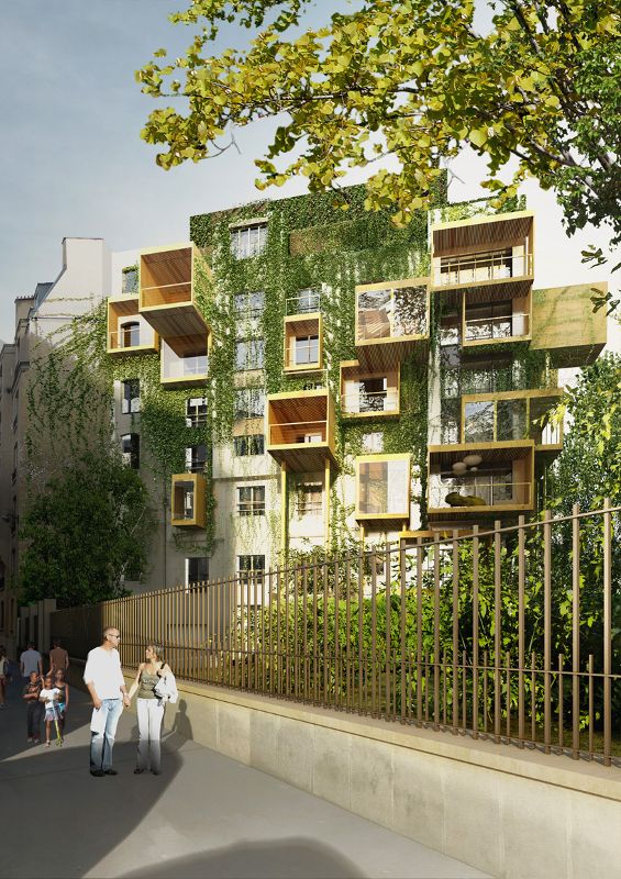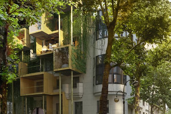 為了解決法律的限制,stéphane malka打算居住在立面上,在一層使用立方體盒子擴展住宅,同時從立方體盒子上懸挑出帶有落地窗的空中花園,露臺或者大小可變的涼廊。方盒子的結構由生物合成木料做成,實現了結構的輕質和現場安裝的高靈活性。插入到現有建筑的立面,擴展部分累積起來將建筑物的能源消耗分為四部分,每一部分建筑復原所消耗的能量平均每兩年45千瓦時。