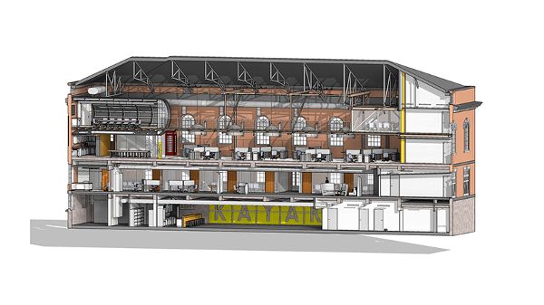 懸掛的機身由加固的桁架所支撐,機身僅僅可以由搭接的行人天橋廊道訪問進入,它所強調的是干預的浮動性質和航空性質。該機身本身容量可以容納有一個數字虛擬會議中心,這個數字虛擬會議中心將總部與全世界的其他皮劃艇辦公室連接。 一個未完成的特征點通過暴露的工業制品和管道系統的增加來舉例說明,但是由地下室衍生出來的的建筑物已成為建筑學組成中的基本元素。