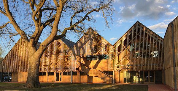 建筑材料自始自終都是在它們自然狀態(tài)下被使用的:一個格柵形式的木質隔板遮蔽了人口的樹冠和外部的人行道,創(chuàng)造了一種歡迎進入這座建筑里的姿態(tài)?!巴ㄟ^這個敏感的選址、建筑形態(tài)和材料的選擇,這座建筑與相鄰的現(xiàn)有建筑進行了對話,在這個擁有豐富歷史的復雜場地上?!币粋€評委在授予2017 RIBA自然獎項給這個新中心的時候解釋說。