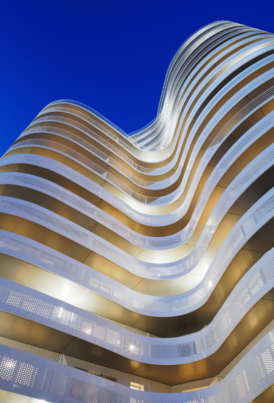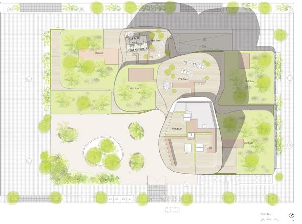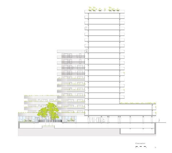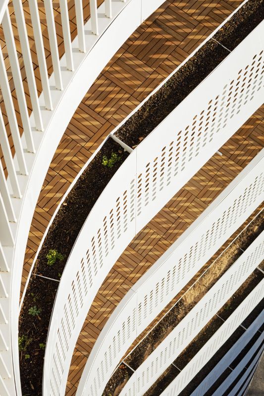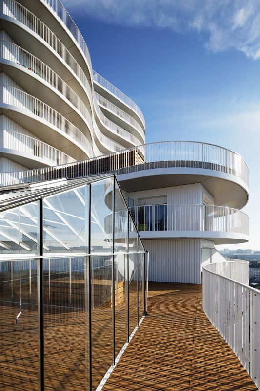 設計團隊為New’R 公寓樓提供了外部環境和內部環境的多樣性。僅對這156間公寓來說,就涵蓋了40種不同的類型。而公寓的共性則承襲于塔狀公寓樓向外拓展的特性,這種共性給居民提供了歸屬感和可辨識性。位于較低樓層的公寓有內置于陽臺欄桿的植物容器,而較高的樓層則有陽臺,成為任何障礙物視野下的大型全景屏幕。這些植物的存在是為了確保最適宜的生存條件。兩個共享平臺的設計使鄰居們可以聚在一起。蔬菜園、溫室和工房提供給人們參加組織活動的機會,例如如何種植農作物。