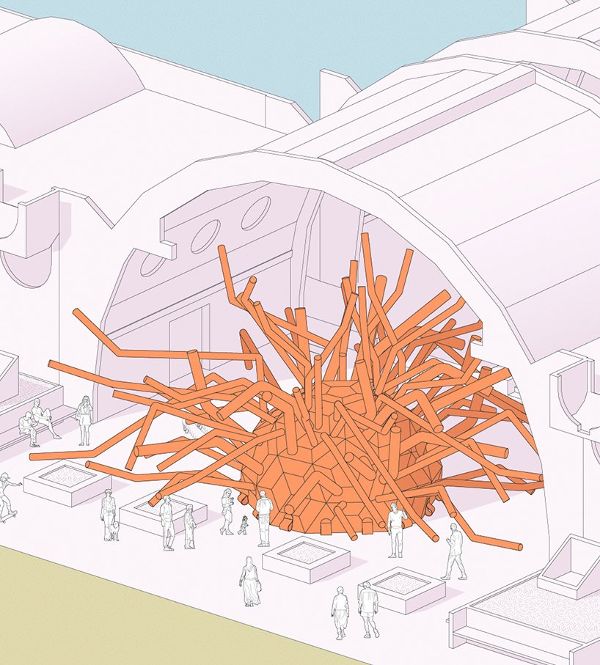 shelby hamet的臨時 "scuttlebutt "庇護所通過充氣式建筑探索了建筑的短暫性。建筑是個有圓形窗戶的圓頂,這個項目創(chuàng)造了一個慶祝性的聚會空間,同時也承認了一種集體的悲痛感,因為全世界都在期待全球大流行病的結(jié)束。謝爾比用防裂尼龍縫制了整個項目,將代表悲傷的五個階段的彩色符號插入她的氣動外殼中。她把這件作品稱為 "scuttlebutt",在這樣一個充滿挑戰(zhàn)的時刻,需要一種熱情洋溢、挑釁的回應(yīng)。