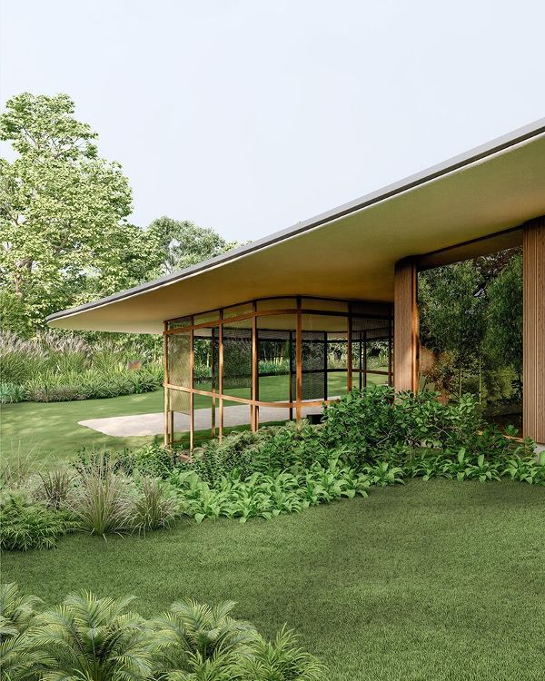 這座房子經過精心設計,充分利用了自然光和通風的優勢。這組體量由一個光滑、輕質的金屬弧形屋頂統一在頭頂上,使空氣能夠在整個空間內循環。所有獨立的體量都能接受植物的生長,并表現出一種親密無間和自然的氛圍。因為這些開口也邀請自然陽光進入房屋深處,所以對人工照明的需求降到了最低。