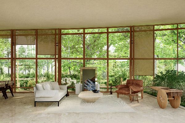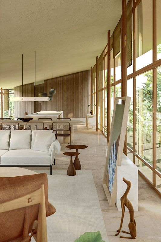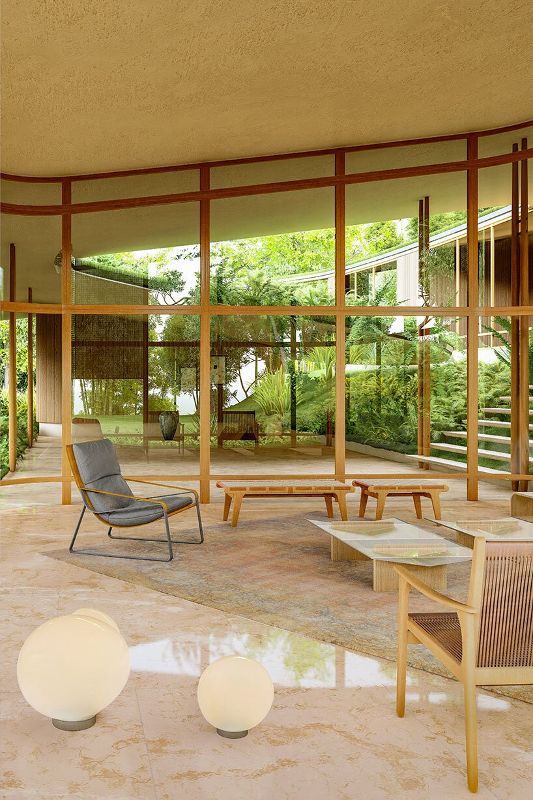 Victor B. Ortiz在Taperá住宅中使用了當地的天然木材,包括一些家具和窗框。隨著這種深思熟慮的材料調色板在整個住宅中的表現,家具元素和建筑設計一起創造了一個令人興奮和統一的設計語言。例如,柱子的細節采用了傳統家具設計中的木榫,從而最大限度地減少了硬件的使用,有利于將移動的室內元素融入整體建筑。