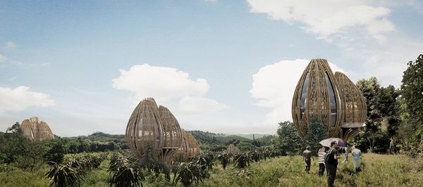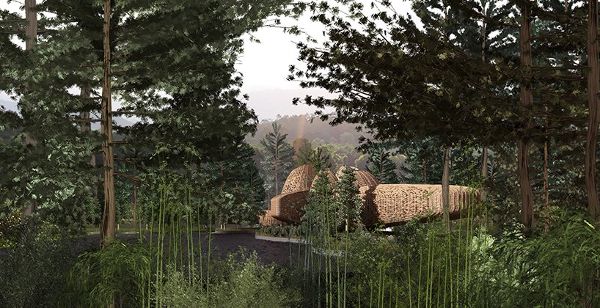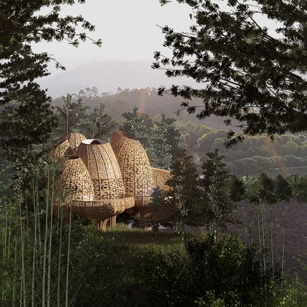 設(shè)計(jì)師的目的是將每個住宅分散布置,以減少它們在樹林中的整體視覺影響。建筑語言的靈感來自于經(jīng)常存放在一起的舊竹米籃,它們以不同的形狀和大小聚集在一起。設(shè)計(jì)通過每個竹制品在密度和質(zhì)地上的細(xì)微差別,回顧了散落在森林景觀中的這些竹籃的形式和質(zhì)地。