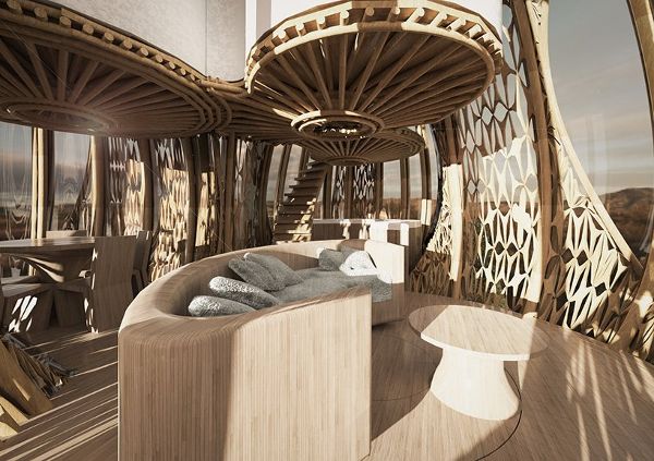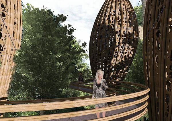 這些建筑主要是由彎曲的竹竿框架捆綁而成。這使這種快速生長的可再生材料的生態(tài)效益最大化,而這種材料通常用作建筑工程的腳手架。在主要框架之間是一個由纖維編織的網(wǎng)絡(luò),形成不同密度和圖案的表皮。這些元素更多的是被切割成靈活的條狀,根據(jù)建筑朝向需要不同的遮擋程度,采用不同的圖案。地板是由簡單的暴露在外面的竹竿徑向排列和分層形成平臺和樓板構(gòu)成的。