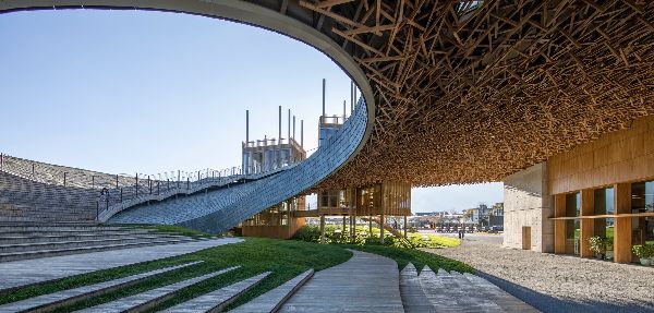 在形式上表現(xiàn)為有機(jī)形狀的山丘,部分下沉的空間就像一個自然的花園景觀,保證了高體驗(yàn)質(zhì)量,并延續(xù)到內(nèi)部的公共劇院。該空間包括劇院、露天劇場、排練廳、咖啡館/餐廳、設(shè)計(jì)商店和辦公室。該建筑是由該地區(qū)的景觀和氣候的適應(yīng)性來定義的,使其更多地被淹沒在周圍的環(huán)境中。此外,木格子的形式允許光線進(jìn)入,創(chuàng)造了一個陰影的游戲,并照亮了地面。