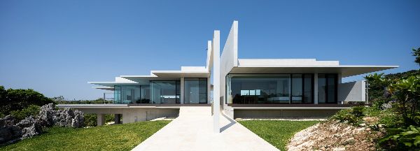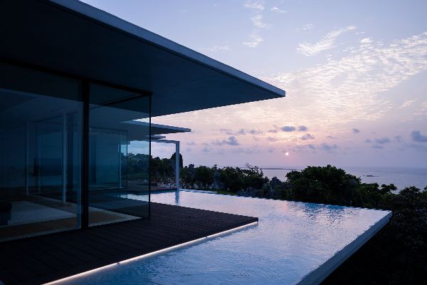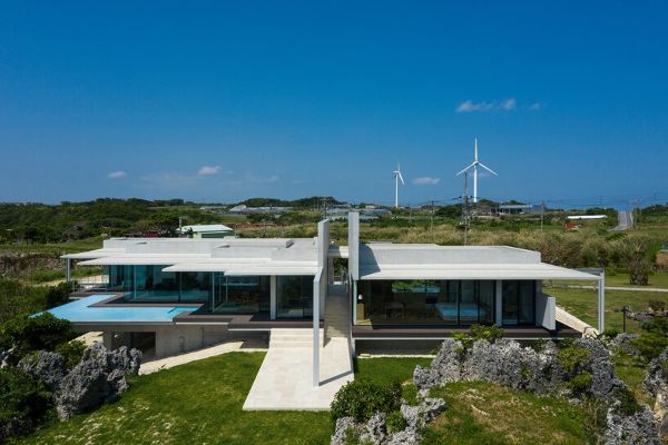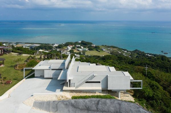 城戸崎建筑研究室設計的“南喬別墅” 是一座混凝土住宅,坐落在日本的一座山頂上,擁有廣闊的太平洋景觀。該項目包括一對排屋,使客戶能夠充分享受豐富的自然環境和廣闊的全景。該建筑位于比周圍山丘更高的山頂上,可以通過一條穿過沖繩石灰巖的斜坡進入建筑及其場地。日本建筑工作室的創始人HIROTAKA KITOSAKI指出:“這個斜坡帶來了一種令人振奮的感覺,仿佛你被拉進了沖繩開闊的藍天。兩面裸露的混凝土墻從西北到東南動態地延伸,將天空和大??虺梢粋€垂直的風景”。