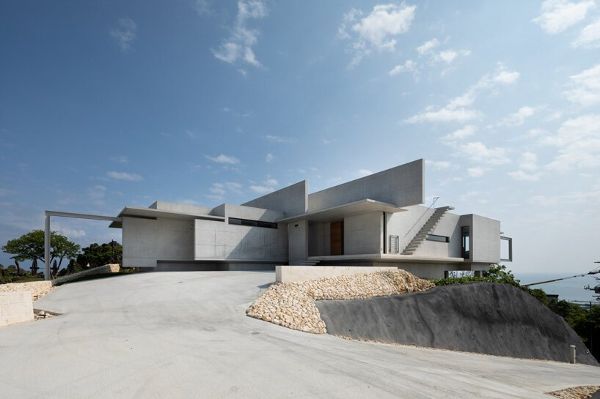 南條別墅位于南條市的一座小山上,俯瞰太平洋,視野集中在分隔天空和海洋的地平線上。東邊可以看到自古以來被認為是神圣的島嶼--庫達卡?;嗥榻ㄖ煿ぷ魇业幕嗥檎f:“從庫達卡的日出到西海的日落,廣闊的全景使我們能夠欣賞到全天的風景,到別墅的周圍環境”。除了東側的相鄰房產,所有與道路相連的區域都在懸崖上。坡道確保了西側的通道,那里的高差很小。通往建筑的道路被設計成一個狹窄的構圖,沒有任何景觀,這樣它就成了內部的前奏,在那里,視野開闊到地平線。