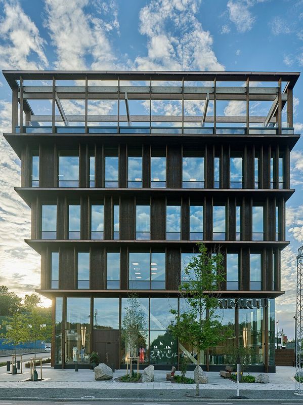 瑞典的白建筑事務所,在瑞典的Gothenburg建造了“樞紐”,這是一座五層的辦公大樓,外表皮是木制框架。五層交錯遞增的建筑揭示了木材在現代建筑中的可能性,滿足了當今的需求。從地板到天花板的玻璃窗框住了木質骨架,使其醒目的入口層暴露出來,邀請路人窺視。