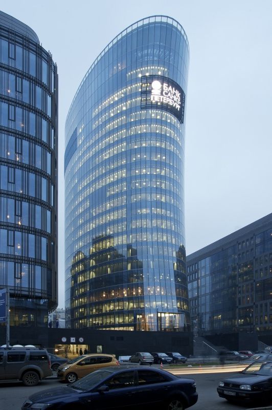 圣彼得堡銀行金融集團的行政總部坐落在涅瓦河和奧克塔河交匯處的河畔,它是奧克塔新綜合建筑開發的一部分。涅瓦河畔的一組典型新樓盤正在努力與南側和北側的原有建筑和諧相處。建筑高22層,它的新立面處在綜合建筑群的主軸線上。圣彼得堡銀行是建筑群的中心建筑,兩側是兩座9層高的翼樓。這三座建筑坐落在同一個基座上,不同的體量就此被統一在一起。基座的兩層地下停車場為該中心提供了充足的停車位。跨越堤壩的人行天橋最終使設計的重點放在河岸與塔樓之間的新軸線上。帶水上觀景平臺和餐廳的游船碼頭最終將行政大樓與城市的主要干線連接起來。這項規劃是同圣彼得堡的葉夫根尼?格拉西莫夫及其合伙人公司(EGP)合作來進行管理的。