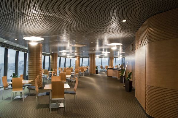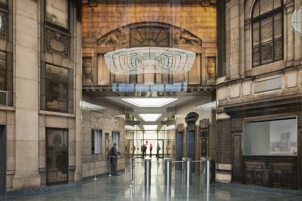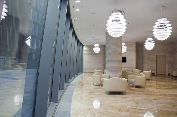 兩座翼樓和塔樓的室內大堂和公共區域的設計是根據這三座建筑不同的建筑類型量身定制的。只有銀行建筑間廣場上的花崗巖鋪地材料延伸到主大堂內,使室內和室外具有一定的連續性。塔樓雙層高大廳的室內更是全部采用玻璃,以更好地接待用戶和游客。像魔術拼貼畫一樣的大型板材上呈現出原有的圣彼得堡銀行大樓的部分畫面。因此,圣彼得堡成為了充滿自信、不忘本源的公司的代表,同時,它利用了圣彼得堡作為波羅地海大都市的商業傳統。建筑的設計兼顧圣彼得堡原有的城市規劃。