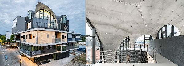 蘇黎世聯邦理工學院的研究人員在2017年推出了他們的超薄、彎曲的混凝土屋頂原型,并在2020年成功完成,現在他們在位于瑞士杜本多夫的新EMPA和EAWAG NEST研究大樓中公布了最終的創新屋頂。這座新建筑擁有復雜的雙曲面混凝土屋頂、輕質纜車地板和自學建筑技術,展示了該團隊近十年來在建筑和可持續技術方面的形成性研究。