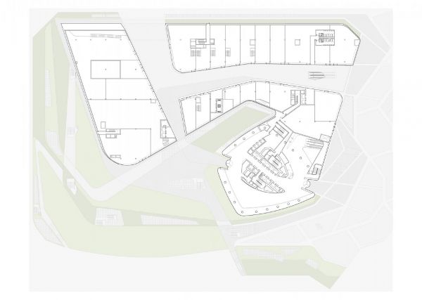 哈迪德設(shè)計(jì)的城市生活住宅項(xiàng)目將成為基地的兩大住宅項(xiàng)目之一,另一個(gè)由利伯斯金設(shè)計(jì)。哈迪德的住宅由七座圍繞庭院而建的線形建筑組成,打造了一道蜿蜒的城市天際線,這些住房最低5層,最高13層。立面采用了纖維水泥和天然木板,有利于凸顯哈迪德著名的流體造型,這種造型體現(xiàn)在了露臺(tái)和陽臺(tái)上。