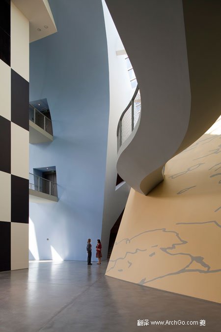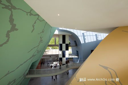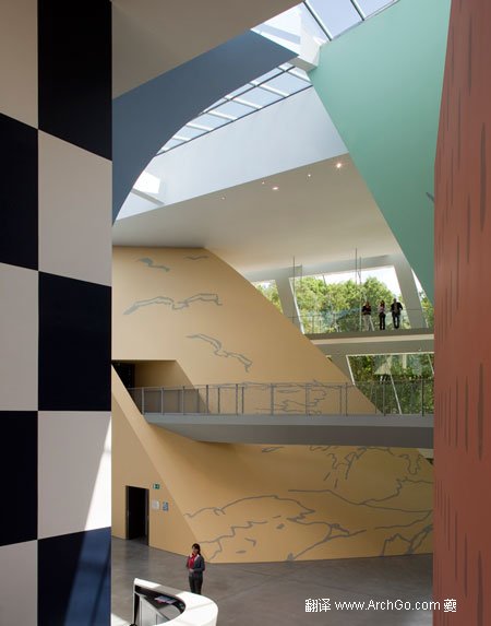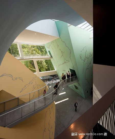 博物館在城市之外,鮑贊巴克認為基地的環(huán)境使訪問者體驗到并側重于“四個景觀元素 ”——四個不同的展覽場地,用不同的形式、顏色和設計來自展現(xiàn)埃爾熱不同繪畫風格。 蜿蜒的行人天橋連接的展示空間,大而夸張的窗戶讓外界的自然光充滿整個空間。