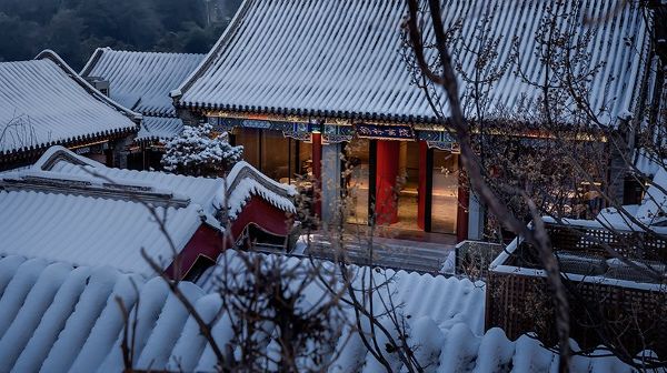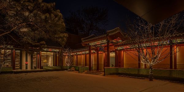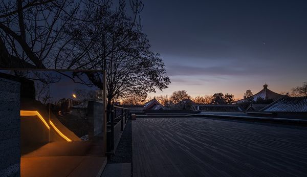 該典型的四合院,有三個(gè)連在一起的院子,周?chē)且幌盗袔в袀鹘y(tǒng)的灰色瀝青瓦屋頂?shù)姆块g,由一條貫穿大院中間的走廊連接。人們從入口處穿過(guò)一個(gè)拱門(mén),通過(guò)走廊進(jìn)入第一個(gè)院子,大理石鋪路石鑲嵌在景觀(guān)水道中,通向一個(gè)被竹子“森林”半掩蓋的開(kāi)放式廚房。入口的右邊是一個(gè)露臺(tái),作為一個(gè)觀(guān)景平臺(tái),客人可以俯瞰院子、北京的帝國(guó)古老學(xué)院和院墻外的胡同。LDH在露臺(tái)層的樓梯墻壁上安裝了鏡面板,所以在客人踏上露臺(tái)之前,可以看到北京老城的倒影和北京的帝國(guó)古老學(xué)院的金頂。